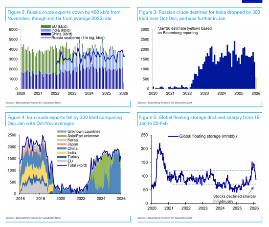 在油市基准假设上,德银指出,此次冲突爆发前,布伦特原油已隐含约6至8美元的风险溢价。若仅考虑伊朗与俄罗斯出口自10月至11月以来各收缩约30万桶/日的基本面变化,合理公允价值约为每桶65美元,而非此前基准的60美元。货运数据显示,海上浮动库存自1月中旬以来已急剧下降,平均去化速度达每日126万桶,在一定程度上对冲了出口收缩的影响。