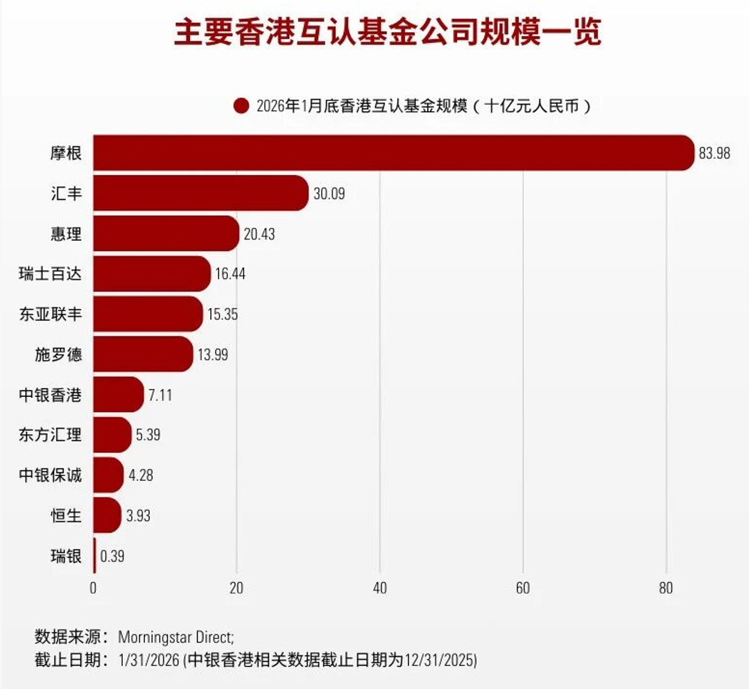 晨星数据显示,截至今年1月底,摩根资产管理(香港)管理8只香港互认基金,总规模达840亿元,市场份额占比超40%,持续在市场中占据领先地位。汇丰和惠理分别以301亿元和204亿元的规模位居第二、三位。紧随其后的瑞士百达、东亚联丰和施罗德,旗下香港互认基金规模均超10亿元。